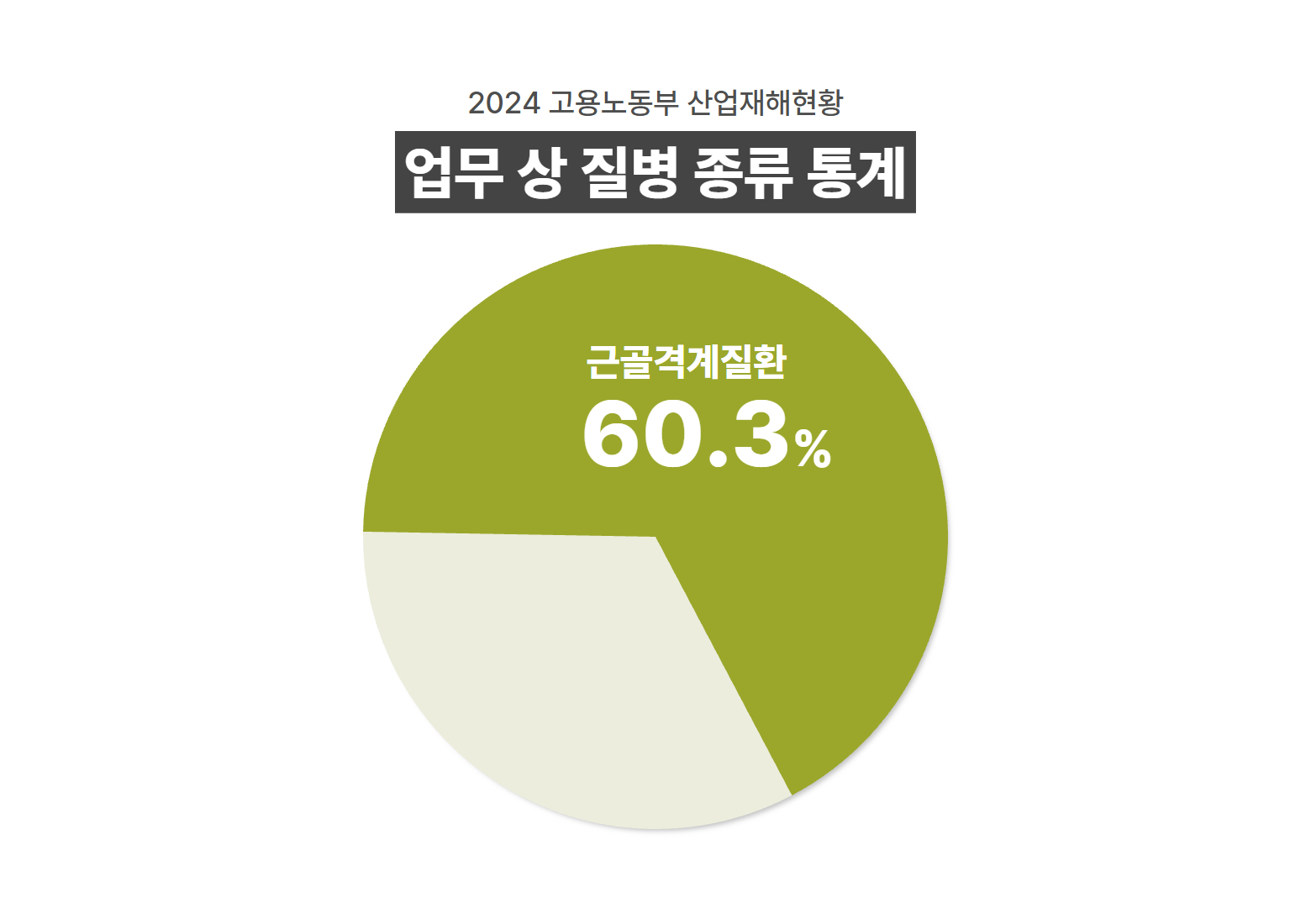이러한 한계로 인해 조사 결과는 적절한 예방관리로 이어지지 못하고, 재해가 반복되는 경우가 많습니다. 실제로 2024년 산업재해 통계에 따르면, 전체 업무상 질병 중 근골격계질환은 60.3%로 가장 높은 비중을 차지했습니다. 따라서 기업은 증상조사표를 단순한 점검 도구가 아닌, 적극적인 예방 전략의 출발점으로 활용해야 합니다.