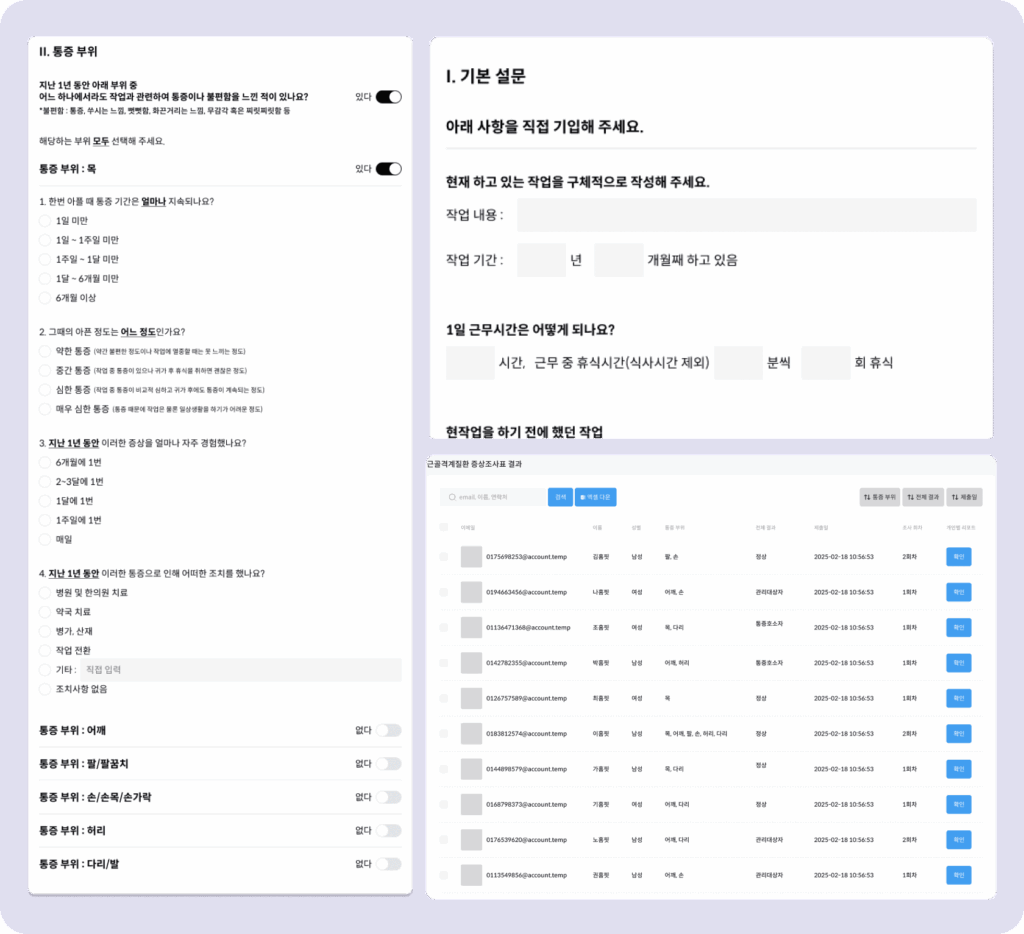 4. 성과 모니터링 및 피드백: 조치 이후 증상 개선 여부를 다시 추적 조사해 개입 효과를 평가합니다. 이는 향후 유사 작업환경이나 직무 개선에도 활용 가능한 조직 내 건강관리 인사이트로 연결됩니다.
