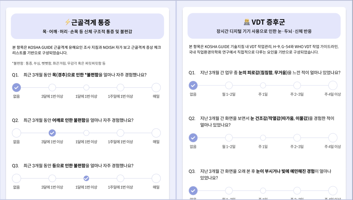 직무 특성에 따른 위험요인, 생활 습관 패턴 등을 분석해 지금 당장 개입해야 할 문제와 중장기적으로 관리해야 할 리스크를 구분합니다.