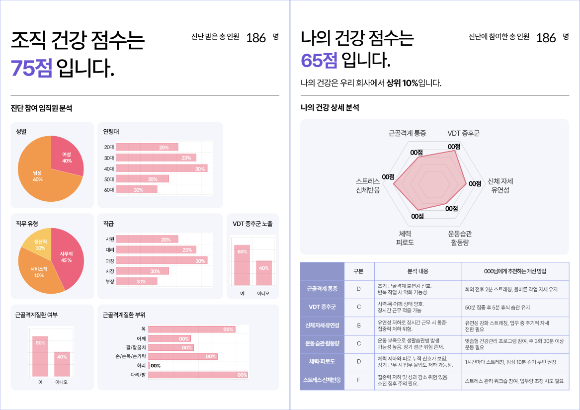 임직원 개인의 신체 상태, 통증 부위, 개선 필요점, 생활 습관 분석 등 즉각적으로 도움이 되는 개인 맞춤형 리포트가 제공됩니다. 개인 리포트는 진단 완료 직후 데이터 자동 분석을 통해 바로 확인할 수 있습니다.