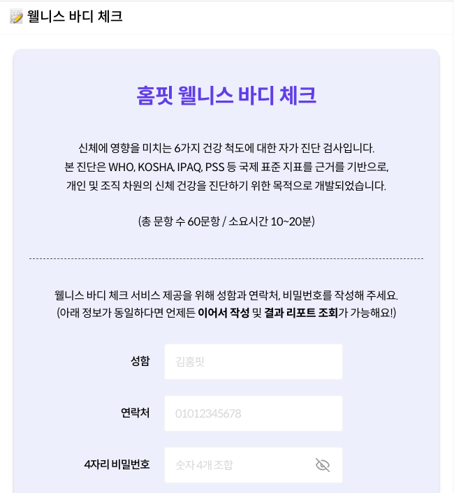 그래서 홈핏은 업계 최초로 기업이 건강 프로그램 운영 전 반드시 거쳐야 할, 웰니스 바디 체크를 새롭게 출시했습니다 🙂